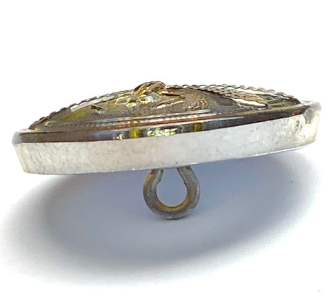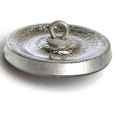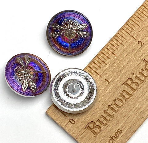 Czech Glass button with a shiny silver dimensional dragonfly on top of rings of blended dark purples, blues and magenta glowing like jewels, changing and flashing in the light. Slightly over 7/8" diameter and about 1/4" thick including the metal shank. Shank opening is around 2mm. Silver foil back. Per button. The best of the best!