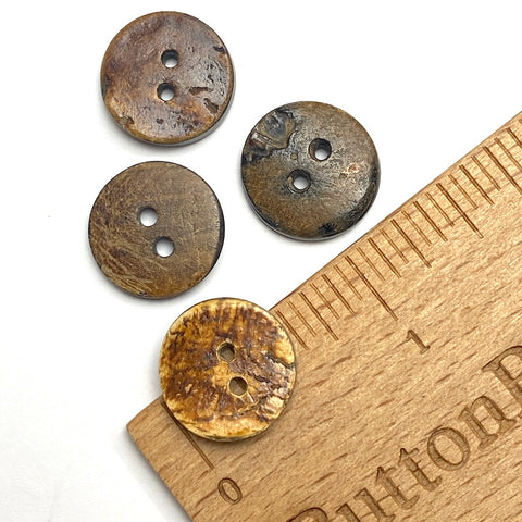 Brown with lots of texture and variance; no two will match and some are quite rustic. Most are fairly round, and some have a bit of shine. Quite beautiful and natural. Most are around 1/8" thick but that varies. 5/8" diameter and about 1/8" thick, but a few vary slightly as you can see. Two holes are about 1.75mm. Edges and backs are mostly smooth, solid black. Hand carved from water buffalo horn; they may look scratchy, heavy and rough, but they're actually smooth and light. Durable and machine washable/dryable. Sold per button.