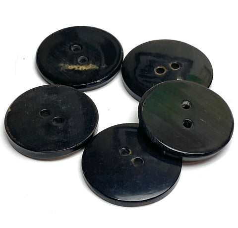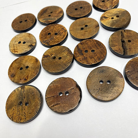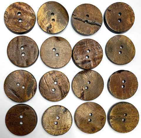 Many shades of brown, lots of texture and variance; no two will match and some are quite rustic. Most are fairly round, and some have a bit of shine. Quite beautiful and natural. Most are around 1/8" thick but that varies. 1.25" or slightly less, about 1/8" thick. Two holes are about 2.25mm. The backs are mostly smooth, solid black. Hand carved from water buffalo horn; they may look scratchy, heavy and rough, but they're actually smooth and light. Durable and machine washable/dryable.  Sold per button.