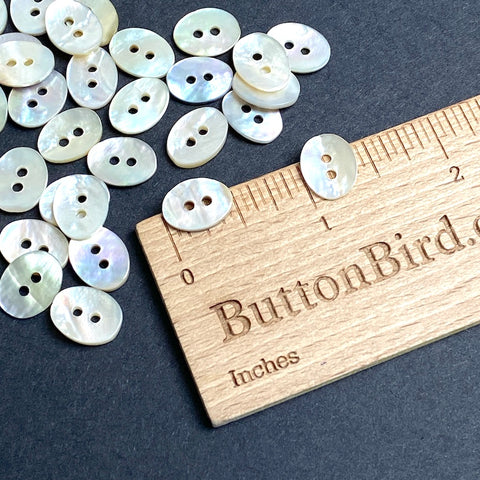 Glistening, iridescent natural off-white/pearly tan Mother of Pearl (MOP) shell button is just 1/2" the long way, and 3/8" across. 5/8" x 7/16", with two 1.75mm holes. Natural variance per the photos; some towards pale rainbow colors and some with pretty, from-the-sea inclusions. Backs are mottled brown. Sold per pack of 36 buttons.