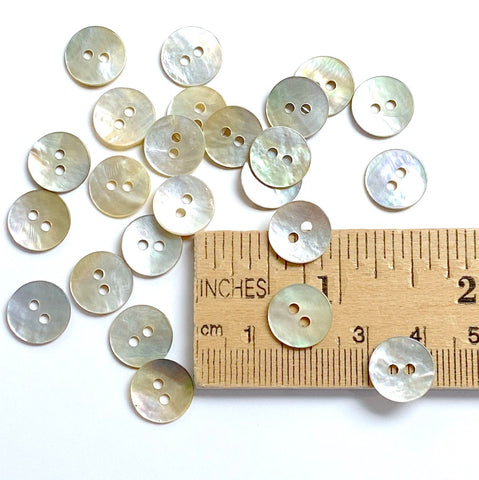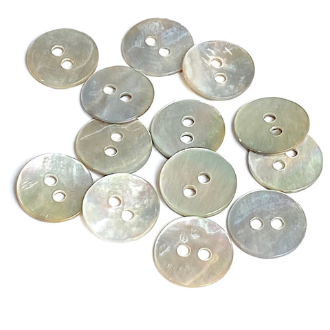 Glowing light neutrals, nearly-whites and ephemeral pastel rainbows, changing from pearly silvers to pearly golds as they move in the light. High quality Agoya shell, which is known for its strength, even when the button is fairly thin as these are. Smooth, sleek and glowing, some curve up a bit, no two will be exactly alike. (These are real shell, not plastic!) Backs are mottled and darker, smooth but not as smooth as the fronts. Diameter 11mm / 7/16". Holes are about 1.5mm. Natural shell. Sold per pack of 60. Hand wash gentle, air dry. Do not dry clean.