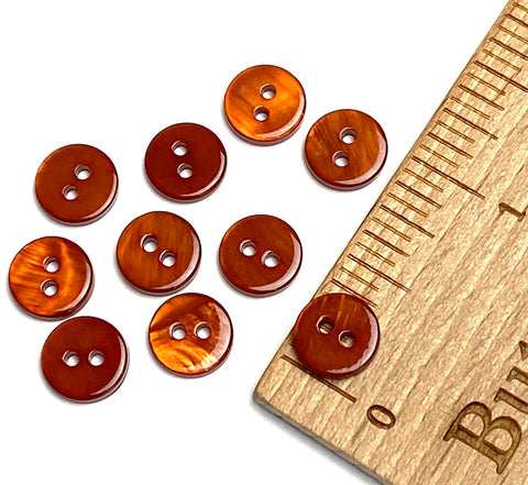 Coppery reddish-brown, small, beautiful high quality 3/8" dyed river shell button is about 1/16" thick. Just enough of the natural shell's glow comes through to create a lovely sheen and slight iridescence. (Clearly these are not plastic buttons!) Front and back are just the same. Satiny, smooth and thick, beautifully dyed, for your best uses. Holes are about 1.25mm. Diameter: 9mm / 3/8".