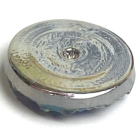 Blue-greens and magentas, sometimes bits of bright green, with hand-painted silver accents. Layers of glass create shine and flash. Almost 3/4" diameter and about 1/4" deep with the shank. Slightly domed front, shiny flat silver back, and NO SHANK, no backing. Finest quality very iridescent artisan Czech glass cabochon. Per cab.