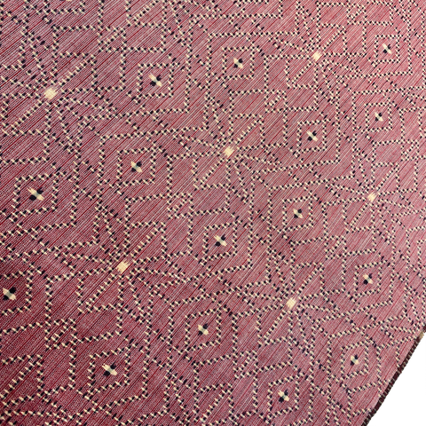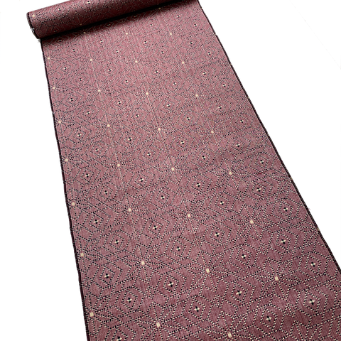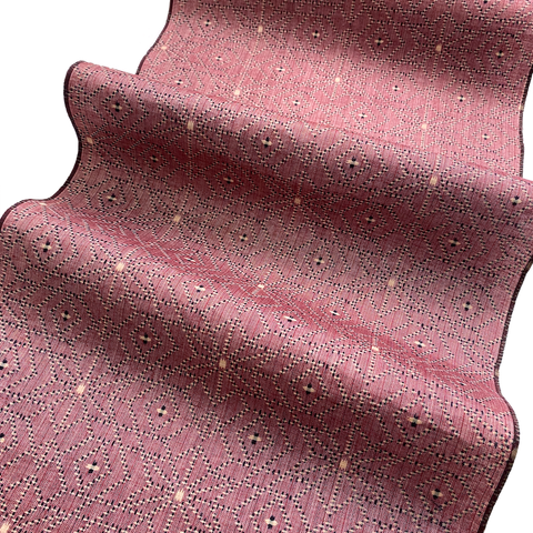 Muted wine and mulberry tones, vintage kimono silk in a complex ikat weave with cream and black asanoha, (hemp leaves) design. Thin and lightweight with a bit of sheen, soft, smooth, a bit crisp with some body and no drape. A true ikat, both sides are the same. The camera sometimes creates a non-existent gray cast because the detail in the weave confuses it; but don't worry, the mulberry color is consistent, with no darker or lighter areas. 14" wide and sold by the full yard; we'll cut yours in one piece from the never-used, excellent condition, probably handwoven and one of a kind, vintage bolt. 100% Silk. Japan.