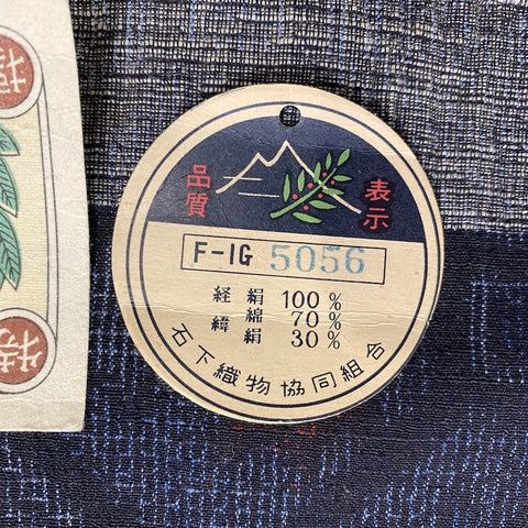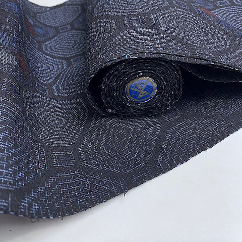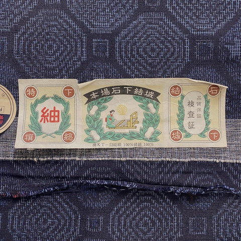 Several blues, lots of black, and dark combine to create this geometric ikat from Japan. It's unusual in its texture: the silk and cotton combine to create a crisp, light, not silky-soft, slightly sheer, linen-like feel. Also, there's a label mystery, which is rare in old Japanese kimono fabrics.  The large label reads warp 100% silk and weft 100% cotton. The other, smaller label reads warp 100% silk and weft 70% cotton and 30% silk.  The weave is a bit open and quite textured, with a dry hand. It's not smooth, not shiny. The overall color reads as dark, deep rich stunning midnight with lots of black, plus dark red, light and dark blue starbursts (?) tucked into many of the octagons.  A true ikat, both sides are the same.  Label reads Authentic Tsumugi. 14" wide and sold by the full yard; we'll cut yours in one piece from the never-used, excellent condition, most likely handwoven, mud and indigo dyed, one of a kind, vintage bolt. Japan.