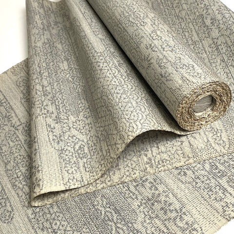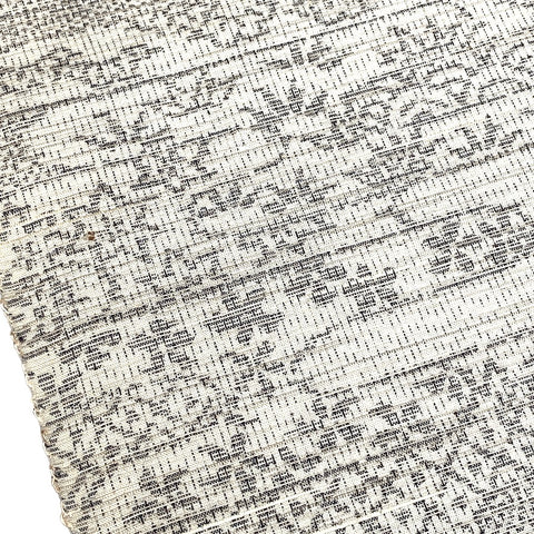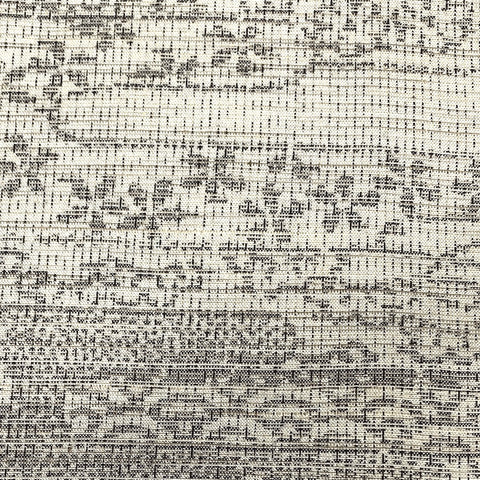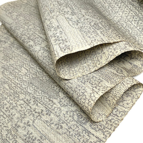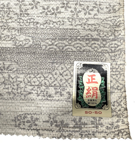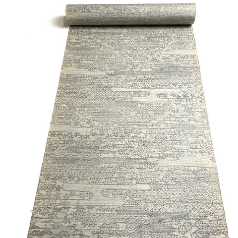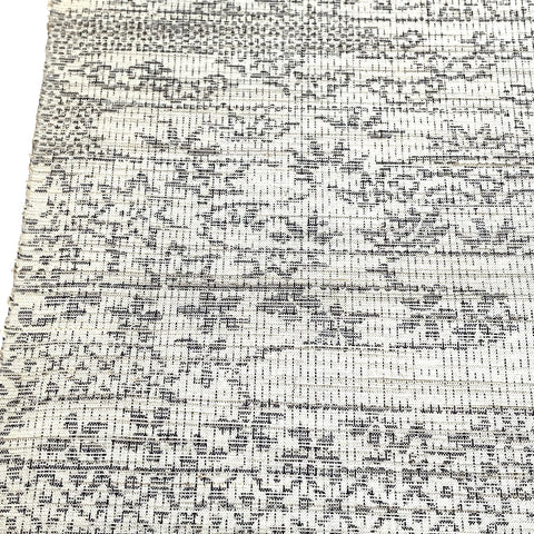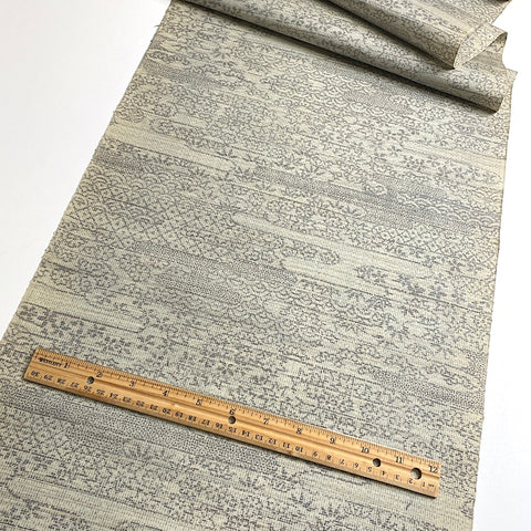Gray on lighter off-white gray, this ikat is full of traditional icons from Japan; waves and plants, trees and flowers and ponds, clouds and more flowers, flowers, flowers.  It's thin and light, soft and supple with slight body, no drape and no sheen. A true ikat, both sides are the same. It's probably 1970's vintage and the edges are bit discolored. Otherwise it's in great condition. 14" wide and sold by the full yard; we'll cut yours from the never-used, beautiful condition, vintage bolt. 100% Silk. Japan.