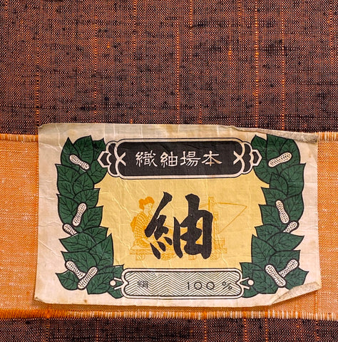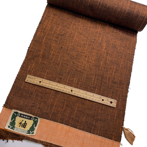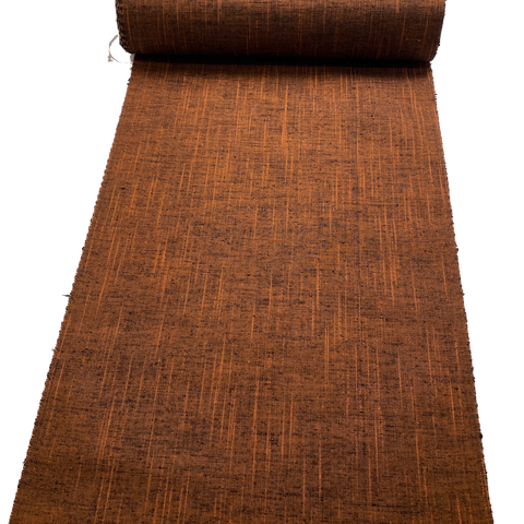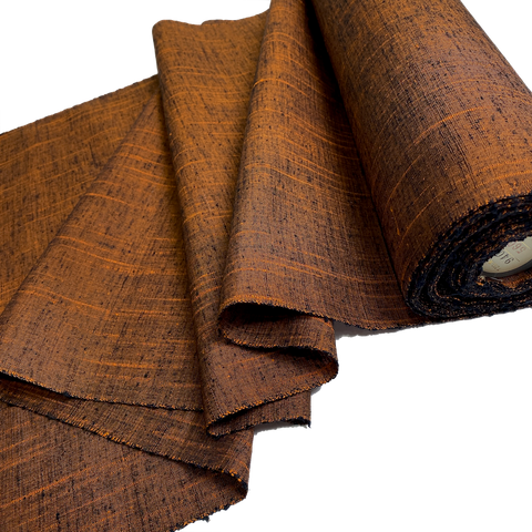 The bright streaks are tangerine orange and thick, and there is so much black it looks charred and smoky. Mid-light weight silk, very textured, soft, rustic; you can see the streaks and texture even from a fair distance. No shine, supple, not drapey, not crisp. Both sides are the same. 14" wide and sold by the full yard; we'll cut yours from the never-used, beautiful condition bolt. Label states Tsumugi, 100% Silk. Exceptional, if you like handwovens and texture. Japan.
