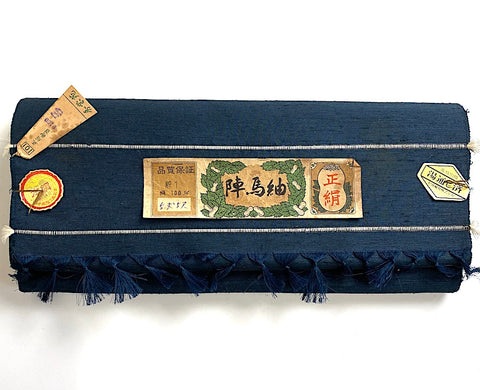 Mid-weight silk probably intended for a men's kimono ensemble including pants and kimono. Mid-weight, thin, soft, supple and textured with mostly black slubs, it's elegant and lustrous. (To me, breathtaking.) It has a bit of body, a slight sheen and no drape. Back and front are just the same. Sold by the full yard and we'll cut yours in a continuous piece from the vintage, excellent condition, very dark midnight/mysterious blue-black bolt. Photographs don't really do it; you have to be there with it. 15.25" wide. 100% Silk. Japan. Stunning.