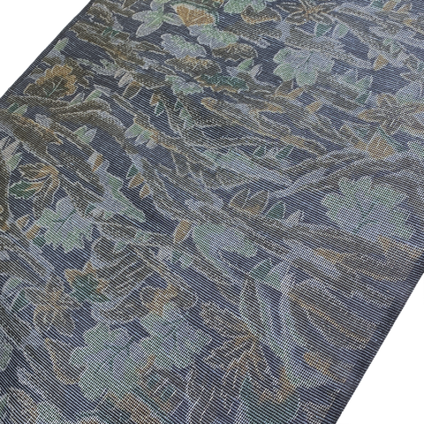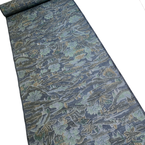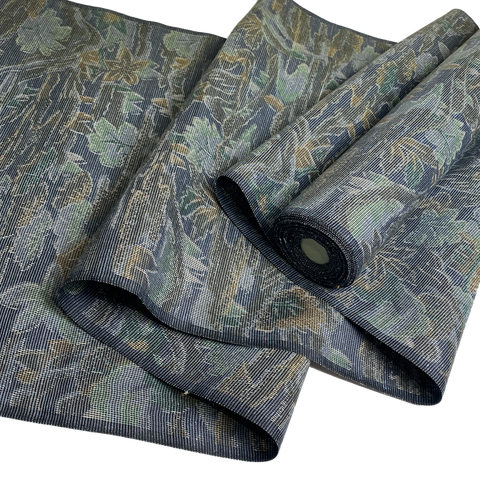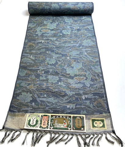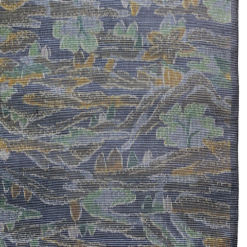 Muted, gray-kissed teals, blues and greens, a bit of ochre. Trees, leaves, homes, mountains, bridges, water, rocks. The outlines are a lighter gray color. True Oshima Tsumugi Silk, certified on the labels. It's thin and light, a bit crisp with slight body, with a very soft surface, no drape and no sheen. This gorgeous silk has the unique Oshima subtle greatness coming from within. A true ikat, both sides are the same. Excellent, pristine condition. 14" wide and sold by the full yard; we'll cut yours from the never-used, vintage bolt. 100% Silk. Oshima, Japan. Extra special, always treasured and increasingly rare.