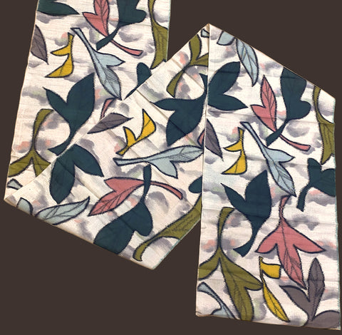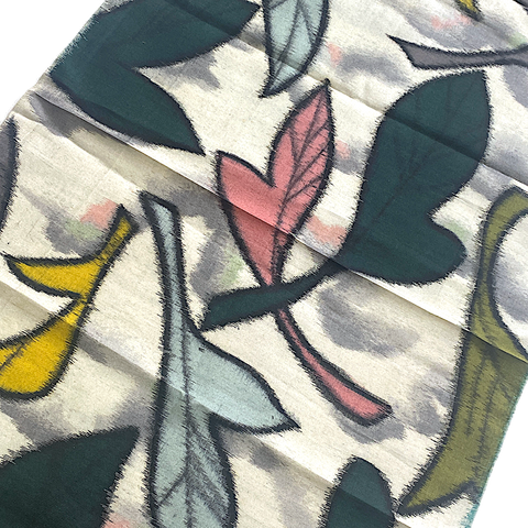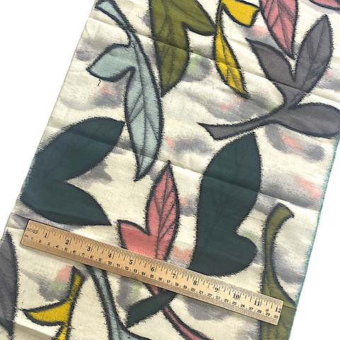 Oversized leaves in black, off-white, pink, very dark green, gold, light blue, olive, and several grays. This silk has Meisen's traditional, desirable blur.  Both sides are just the same, and it's a true ikat, woven with thin, fine silk. There are wonderful thin streaks made by threads of gray and other colors, coming and going in various strengths in the background; like rain or mist or just beauty.  Quite thin and light, and a little crisp, with no sheen. This is the somewhat cottony-feeling type of Meisen. One selvedge is teal, the other is the off-white background color. It does have some fold lines from some of the former seam lines.  An artisan created vintage treasure, from a kimono probably 1930's-50's.  13" wide.  It's 84" long, which is 2-1/3 yards.  100% Silk. Japan. Fantastic and soulful.
