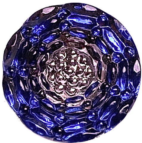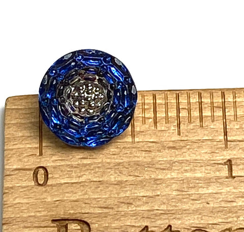 Indigo that may turn grayish blue, purply-black and/or almost black depending on the light, with shiny silver center. Sparkly, 9/16", so a bit larger than 1/2" in diameter and about 1/4" deep with the shank. Shank has 4 tiny holes. Fabulous Czech glass artisan button. Sold per button.