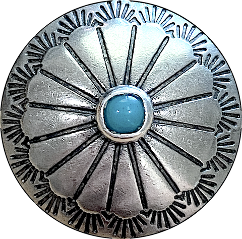 Nickel silver with satin, semi shiny finish. The 16-petaled flower button is 1" in diameter, with a faux turquoise stone in the center. Made in USA by expert concho button artisans. Shank loop back - shank opening around 3mm. This pretty button is domed, and about 1/4" thick including the shank. We also have this button in other sizes and variations, just search for "Southwest Sunflower" in the search bar and they should pop up for you. Sold per button, limited supply.