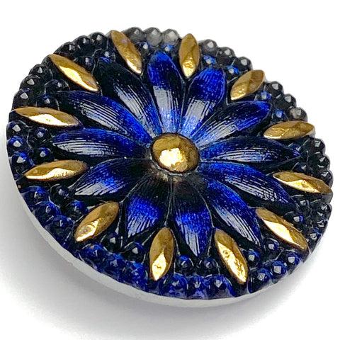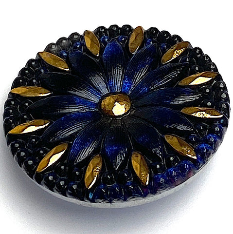 Deep cobalt/Bermuda blue petals turn darker, almost to black depending on the light, before flashing towards lighter again. The tiny round glass 'beads' between the petals are black, so there's great contrast with the metallic gold.  This highly iridescent Czech Glass button was made by hand using the old, difficult, traditional techniques that many Czech artisans are famous for.  1-3/16" diameter and about 1/4" thick. Four tiny holes on the back. Sold per button. Ravishing.