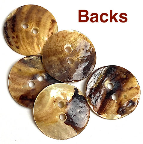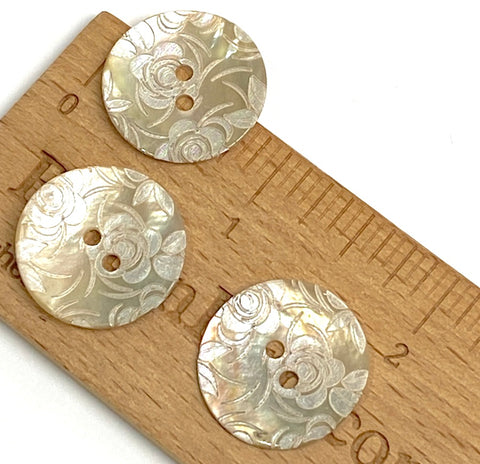 Two-hole button with a detailed design of white roses carefully laser etched on golden tawny beige/ sand-colored shell. Very iridescent! They're dimensional; the roses are etched into the shell so there are two layers, adding light-play. No two are exactly the same as you can see; there is natural shell color variance, and are some flatter than others. The last photo shows the most extreme variance we found in this batch; yours probably won't be that much different. Thin and light. Holes are about 2mm. Sold per pack of 2 buttons.