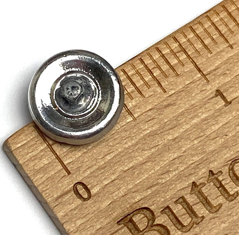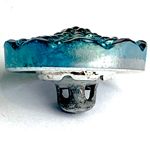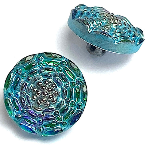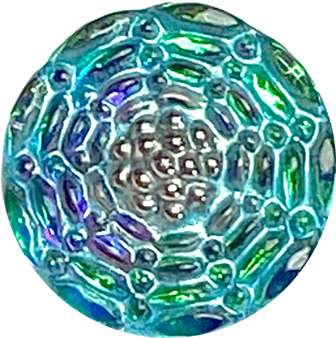 Mostly teals and blues, sometimes some purple, with sparkly silver center. 9/16", so a bit larger than 1/2" in diameter and about 1/4" deep with the shank. Shank has 4 tiny holes. Fabulous, highly iridescent Czech glass artisan button. Sold per button.