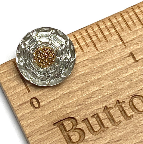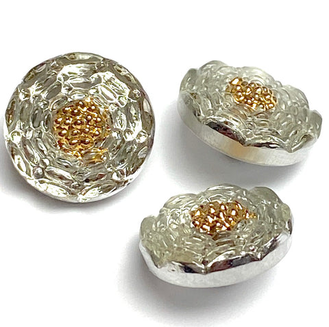 Glass like sparkly silver, plus hand painted glistening gold for the flower's center. We see the 'diamond silver' glass color as slightly more warm than cool. 9/16", so a bit larger than 1/2" in diameter and about 1/4" deep with the shank. Shank has 4 tiny 1mm holes. Fabulous Czech glass artisan button. Sold per button.
