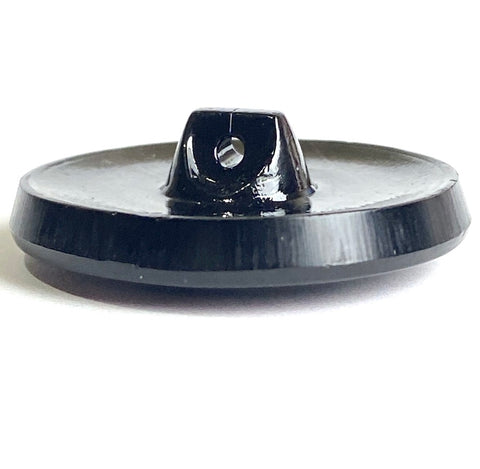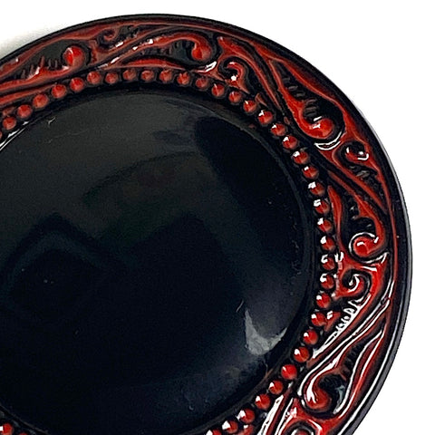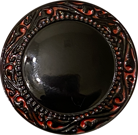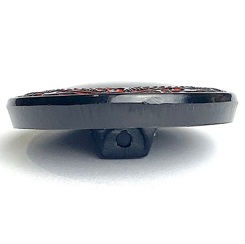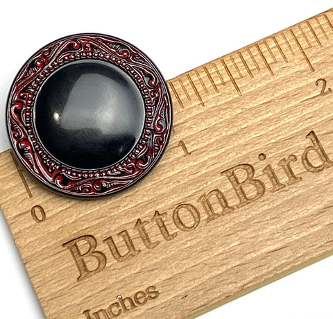 Simple and elegant, shiny jet black slightly raised dome with border of dimensional red and black scrollwork which looks hand painted? The shank is part of the button, with a 1.25mm opening. All shiny, opaque, not iridescent, Czech Glass. Sold per button.