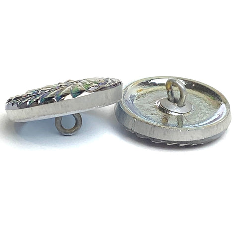 So many constantly changing colors. Breathtaking! Czech Glass with hand-painted silver accents. About 1/4" thick including the metal shank. 18mm/ 11/16" diameter. Shank opening is around 2.5mm. Per button. Czech Republic. Beyond exquisite. The larger size is #CZ-094 and the last photo shows them both.
