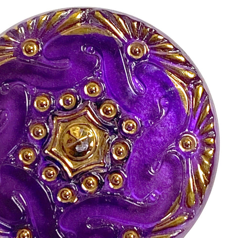 Dark purple and shiny gold, hand-painted, dimensional and translucent, 1-1/16"- 1-1/8" diameter, slightly domed, and about 1/4" thick with the shank. Shank opening is around 2mm. The gold is more vibrant, intricately detailed and glowing than the photos. Limited Supply. Exquisite.
