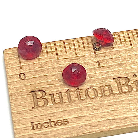 Vintage glass, faceted clear ruby - cranberry red buttons.  Discounted just in case of age-related loose or imperfect shanks. Sold as is, pack of 3 buttons.  5/16"; just over 1/4".
