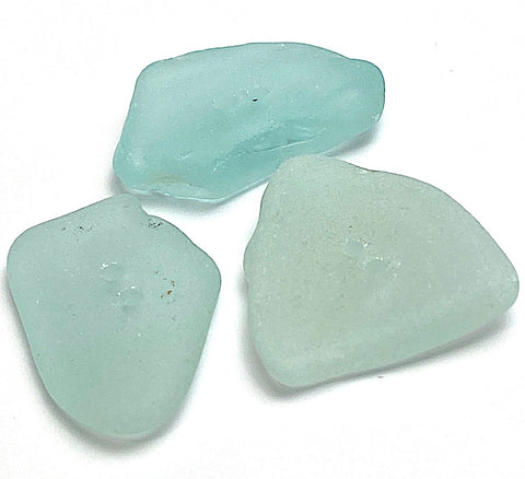 Tumbled for years in the ocean, this sea glass was found on the beach and made into buttons. Soft edges, different natural shapes and sizes, translucent, smooth, with frosty patinas from sea water, waves and friction. Two holes about 1.5mm. You'll receive the exact three buttons shown. They're a bit larger than most we have. Found and drilled in the US.