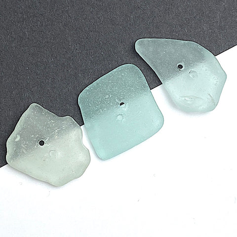 Tumbled for years in the ocean, this sea glass was found on the beach and made into buttons. Soft edges, different natural shapes and sizes, translucent, smooth, with frosty patinas from sea water, waves and friction. Two holes about 1.5mm. You'll receive the exact three buttons shown. They're a bit larger than most we have. Found and drilled in the US.