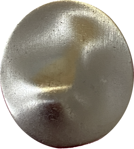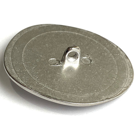 Mostly silver color, with gold tones blending and morphing smoothly, mostly at the top of the 'hill', down the slopes, and on parts of the edge. Not quite oval, it's asymmetrical; the short dimension is 1-1/4", the long side is 1-1/2". They change shape and color constantly in the light. Semi-shiny, sleek satin finish. Metal with shank back; opening around 2mm. Weight 1/2 ounce each. Sold per button. Unusual and wonderful.