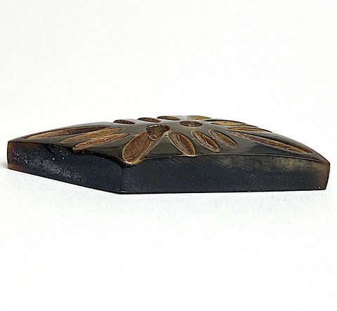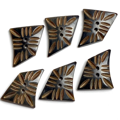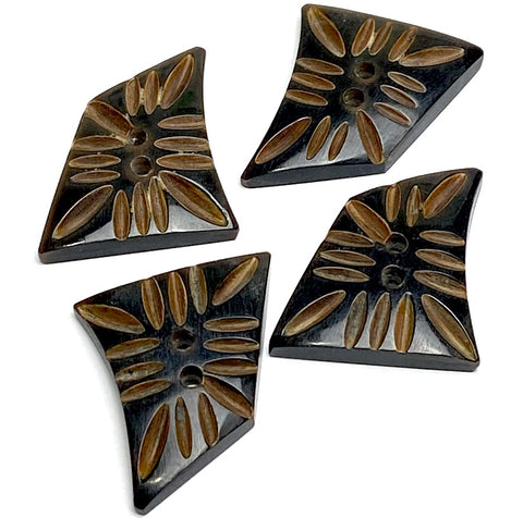 Shiny black 4-sided shape with brown (the natural horn color, we assume) in the recessed grooves. Handmade so no two exactly match, but the shapes are quite close to the same from button to button. They are about 1/8" thick, smooth (not scratchy), durable but not too heavy. The backs are smooth, solid black. Hand carved from water buffalo horn. Machine washable/dryable. 1.5" the long way, about 1-1/8" the short way. Two holes are about 2.5mm. The larger size is #0711 in another listing, and there are photos below of both, for comparison. Sold per button.
