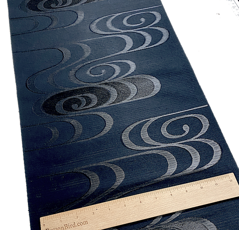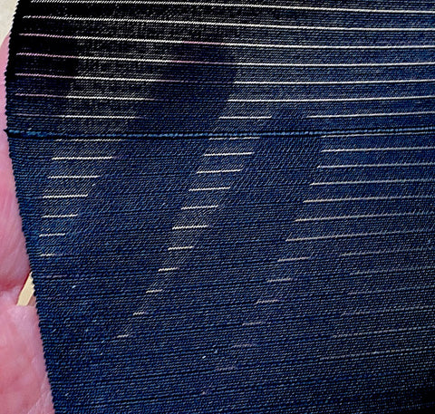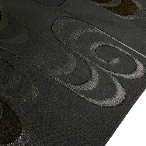 Giant swirls are embroidered with silver, shiny silk that almost looks wet. Every fifth swirl also has a top layer of a bronze color combined with the embroidery, somehow, and is even more dynamic and shiny. All the swirls flash in the light - they're very iridescent and almost impossible to photograph well; sorry. The entire 5 + yards of base fabric is true black, very light, crisp, sheer stripe silk, creating even more light play and joyous confusion. The stripes are solid and between them isn't sheer, or possibly not as sheer? It's true black, no warm or cool cast. This is obi silk; it's 13.5" wide, fancy and dynamic as most obi fabric is. The first 46" is plain sheer black stripe with no swirls, then 91" with swirls, then 50" of plain sheer black stripe silk with no swirls. It's in excellent conditon, never used. Order "1' for the 7-ounce (very light) bolt. Like most vintage silk obi fabric, it's probably one of a kind. Japan! Whew! 100% Silk.