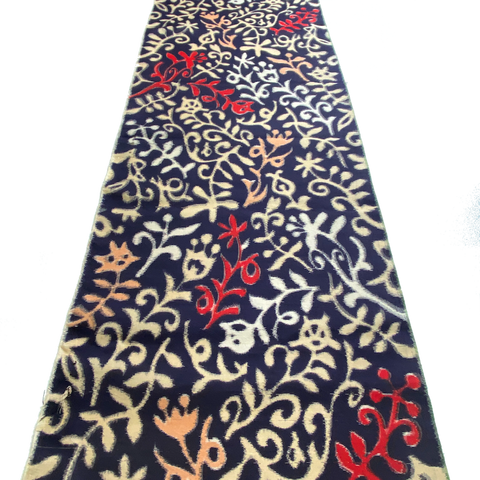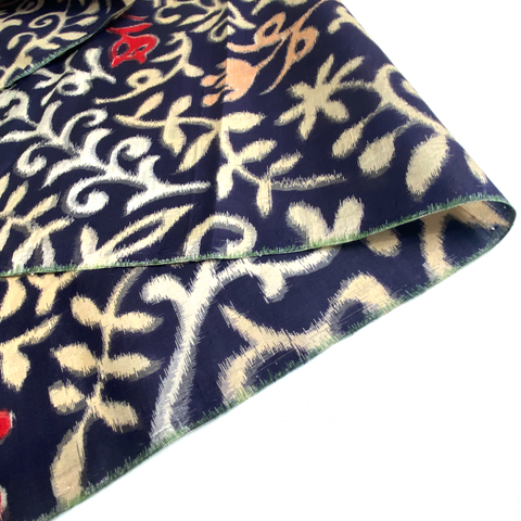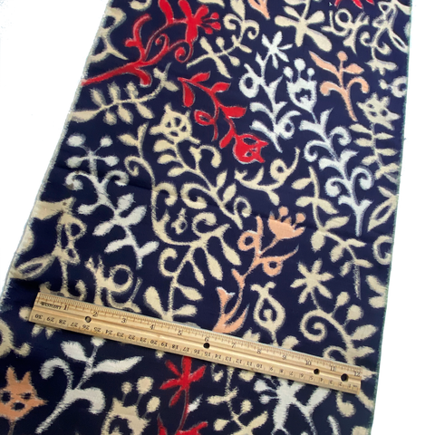 A party of botany, in black, red, off-white, peach and tan. This vintage kimono silk has the classic, desirable, intentional "Meisen Blur", feathered edges where the colors meet. Not a print, it's a true ikat, and both sides are just the same. These pieces are from a dis-assembled kimono. A classic Meisen Japan, it's thin and light, tightly woven, soft, quite smooth, with no drape and a bit of body.  Each piece weighs only 1.2 ounces.  An artisan created vintage Meisen, probably 1930's-50's.  Sold per 14" x 61" Piece. 100% Silk. Japan.