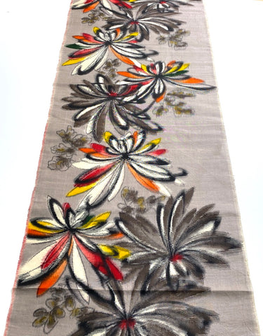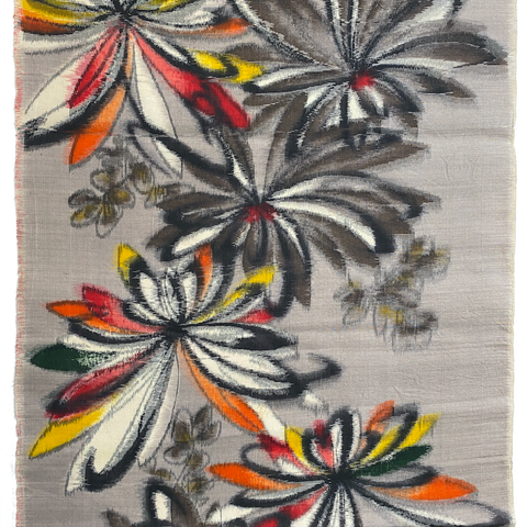 Large blossoms like fireworks, in browns and taupes, black, red, white, forest, orange, neon yellow. The background is cool gray and the entire design seems painterly. It almost seems like it could be inspired by American barkcloth of the same era. An artisan created, vintage treasure, it is a true ikat, so both sides are just the same. It has Meisen's desirable, intentional, traditional blur. One selvedge is red. Thin and light, it's a bit sleek and a bit crisp, with a slight sheen. This silk is from a 1930's-50's kimono, and is in quite good condition. Sold per 14" x 50" piece. 100% Silk. Japan.