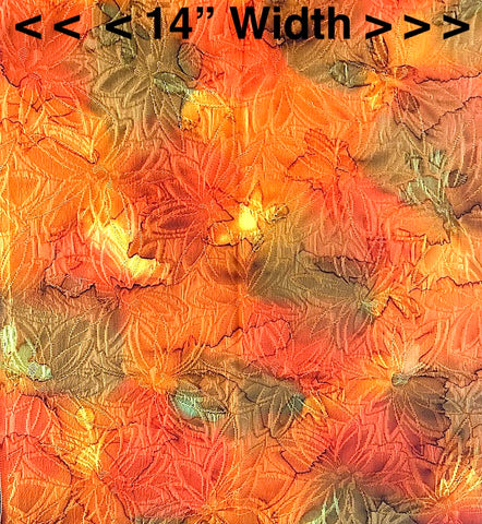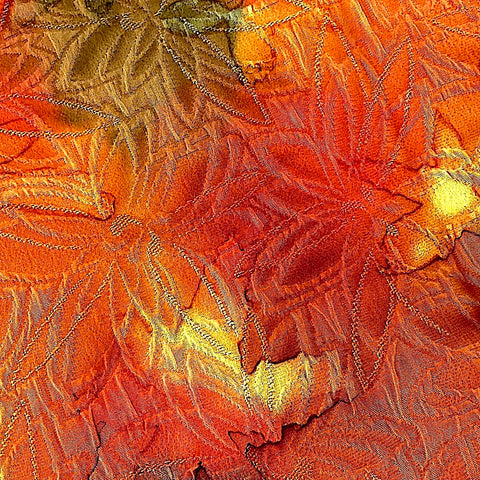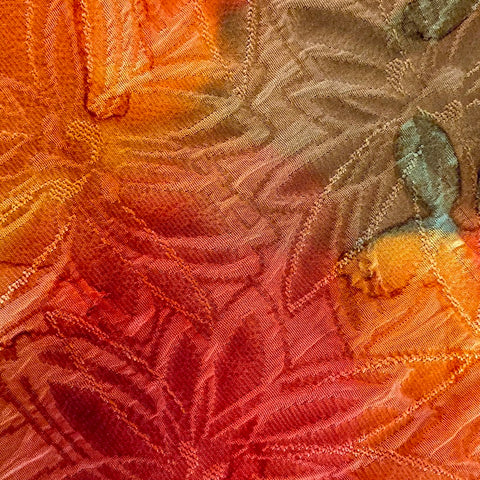 Art silk with layers of Japanese matelasse in the weave, known there as Fukureori; the effect seems quilted. Beneath them is a vibrant, saturated tie-dye probably done by hand, with bright oranges, red-oranges, olives and golds. It's a bit drapey and has body and a bit of crispness. Very textured from the fukureori flower petals. Mid-light-weight, vintage kimono silk from Japan in perfect condition. This is the last piece we have from this kimono.