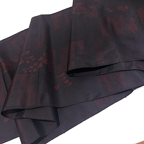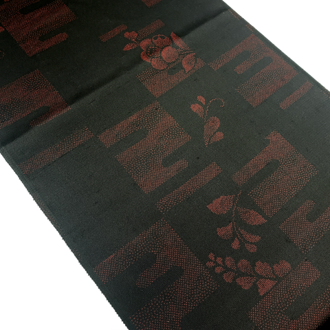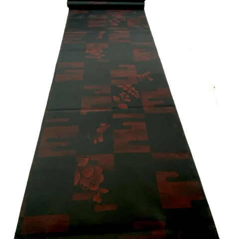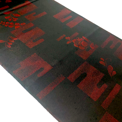 The black is soooo prominent that it nearly hides the bright red design. The closer you get, the more visible the red is, but it's never anywhere near strong or typical.  The first 5 photos are a pretty good depiction of how well the black hides the red. The last 5 photos are adjusted so that you can better see the design. This silk is elegant, thin and light, shiny and sleek on both sides. It's finely woven, a bit crisp, with slight body. Both sides are just the same, and we were told it's an ikat.  But...it seems so perfect and so smooth, and the bolt is 26 yards, so we're not sure it's not a print. 19.5" repeat.  14" wide and sold by the full yard; we'll cut yours in one piece from the never-used, excellent condition bolt. Age unknown.  100% Silk. Japan.