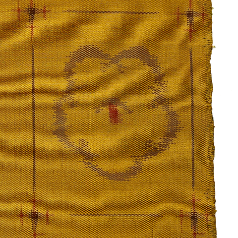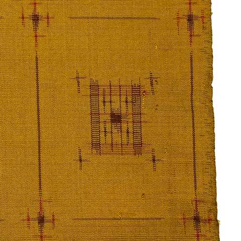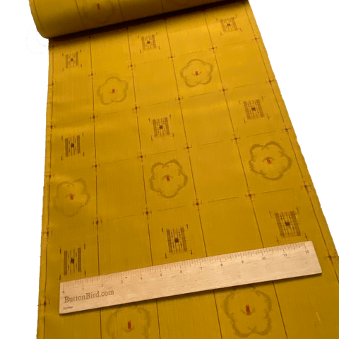 Intense deep dijon gold color, absolutely glowing. The ikat characters and blooms are burgundy and red, very finely woven. It's all done in the weave. This silk is smooth, sleek slightly shiny, glowing, lightweight, lustrous and thin. It has a bit of drape and a bit of body. A true ikat, both sides are the same. 14" wide and sold by the full yard; we'll cut yours in one piece from the never-used, excellent condition, probably handwoven and one of a kind, vintage bolt. 100% Silk. Japan. Exceptional.