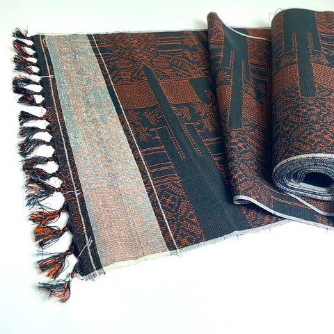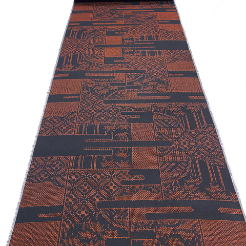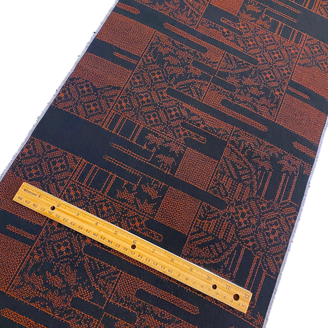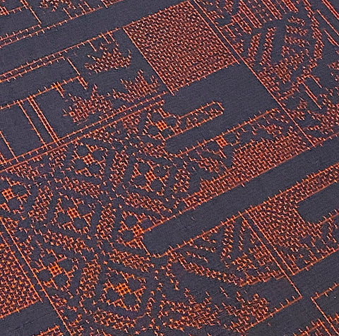 Perhaps inspired by a patchwork of other kimono silks, this ikat is true black and bright red-orange (more red than orange), for an overall dark burgundy/russet look. This silk is almost certainly a handwoven Tsumugi, but there are no labels. It's thin and light, with raw silk's softness, quite smooth, almost the feeling of silk blended with fine cotton.  It has a little body and is a bit supple but not flowy, and not shiny or sleek. A true double ikat, both sides are the same. The color is more towards red than orange, and the black is deep and rich. There's no color cast -  in reality the red-orange and black have high contrast together. Selvedges are beautiful gray. The pattern repeat is about 23". Vintage kimono silk in pristine condition, 14" wide and sold by the full yard. We'll cut yours in one piece from the vintage, unused bolt. 100% Silk. Japan.