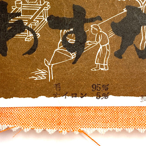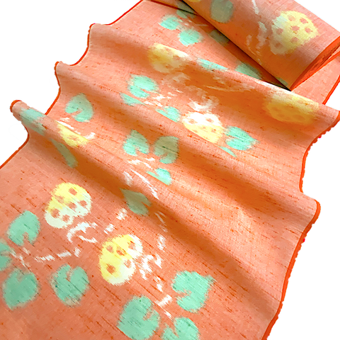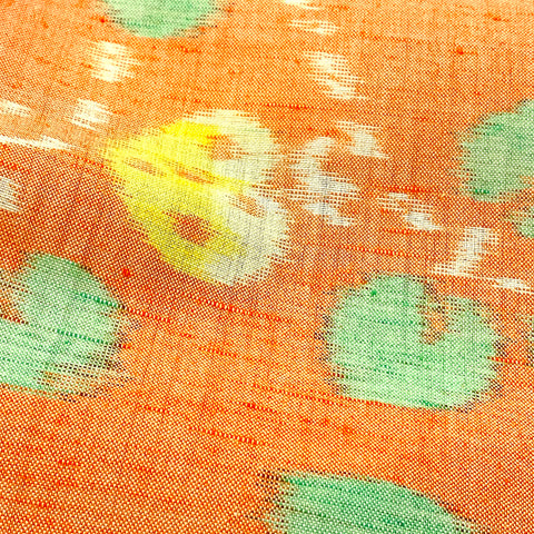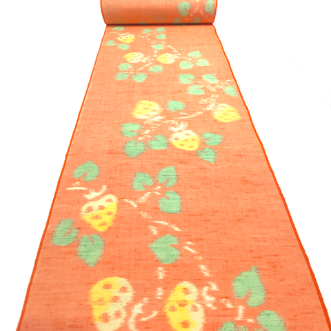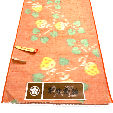 Yellow and white 'strawberry hearts', green heart-like (or gingko?) leaves, on a slubby, light, bright orange with white cross-dyed background. All done in the ikat weave, 95% wool/5% nylon. It's thin and light, slightly see-through, with body and no drape, soft for wool, a bit crisp. Vintage kimono fabric in excellent condition. 14" wide and sold by the full yard. We'll cut yours in one piece from the vintage, unused bolt. Japan.