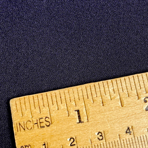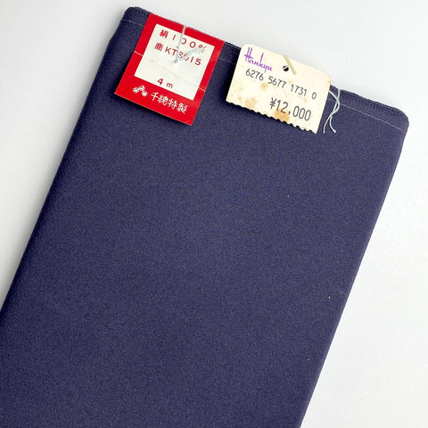 True dark navy, thin, light weight, soft 14" wide silk crepe from Japan. The crepe texture is fine, not very textured or deep but more smooth. We haven't opened it, but you can see it's wrapped around a piece of thin foam, so that the folds aren't so crisp. The folded, thread-tied bolt weight just 5.5 ounces and measures about 5" x 14". It looks in quite good condition; possibly with slight fading? The 12,000 yen price on the shop's attached tag would be around $77 today which seems like it may be a good quality silk for 4 meters. 100% Silk. Not new, but never used. Japan. Order "1" for the bolt.