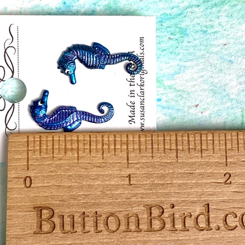 Running Low - Seahorse Buttons, Two in a Set, Hand-Painted Blue Tiny 7/8" Enamel Metal Sea Horse USA Susan Clarke