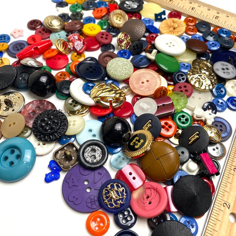 A grab bag of buttons in various sizes, shapes, colors. They're samples, overruns and discontinued styles, all new and unused metal and resin-plastic from our vendor's warehouse organizing project. We don't see any seconds; they all seem in perfect condition. You'll get the exact buttons shown. We haven't counted, but we're guessing 100-150?