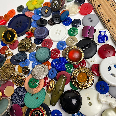 A grab bag of buttons in various sizes, shapes, colors. They're samples, overruns and discontinued styles, all new and unused metal and resin-plastic from our vendor's warehouse organizing project. We don't see any seconds; they all seem in perfect condition. You'll get the exact buttons shown. There are least 225 in your mix, which weighs almost a pound.