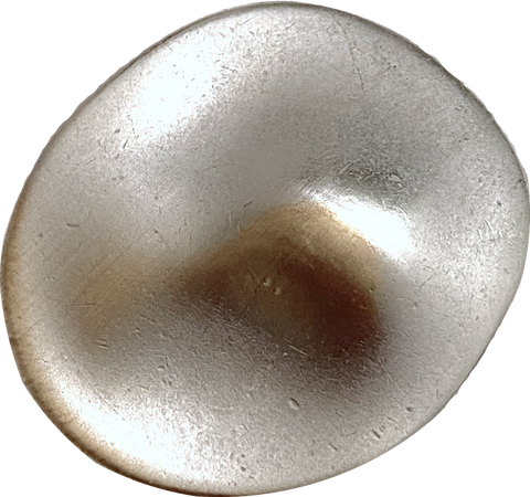 Mostly silver color, with gold tones blending and morphing smoothly, mostly at the top of the 'hill', down the slopes, and on parts of the edge. Not quite oval, it's asymmetrical; the short dimension is 1-1/4", the long side is 1-1/2". They change shape and color constantly in the light. Semi-shiny, sleek satin finish. Metal with shank back; opening around 2mm. Weight 1/2 ounce each. Sold per button. Unusual and wonderful.