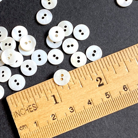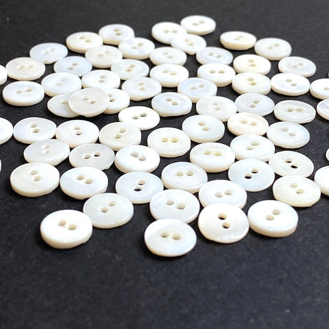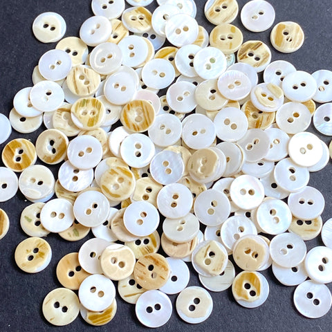 Very small, 3/8", opaque, mostly true white with some a bit towards ivory. All the backs (and none of the fronts) are butterscotch. They're about 1/16" thick and the hole is about 1.5mm. Satiny, thick, smooth and a bit shiny but not iridescent. They are ungraded/un-sorted so some aren't perfect as you can see; probably more for crafts, dolls, embellishment, etc., rather than fine shirts. Pack of 144.
