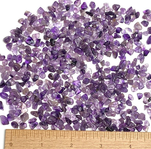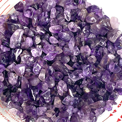 Real amethyst in a range of colors from light to dark purples. Glistening, radiant, polished, small chips in all different shapes and sizes; many seem to be around 1/4".  The few we checked for holes had nearly invisible .5mm holes, for stringing. You'll get 7.7 ounces, in weight, of amethyst chips.  All of them are shown in the last photo.  Order "1" for them all... possibly 1,000-1,500 drilled chips?