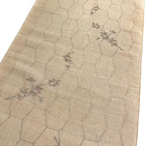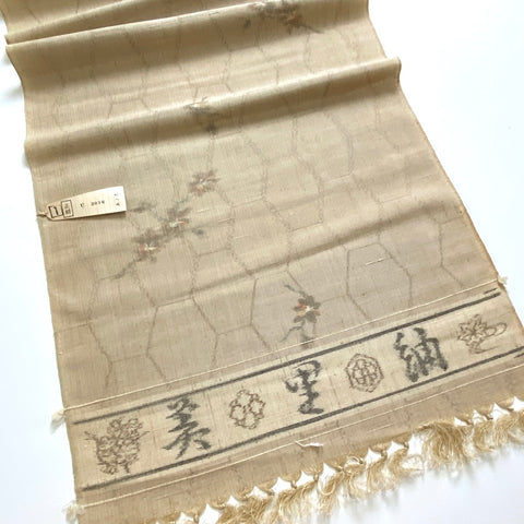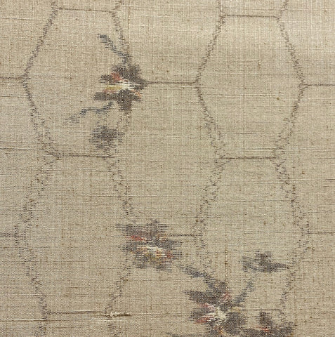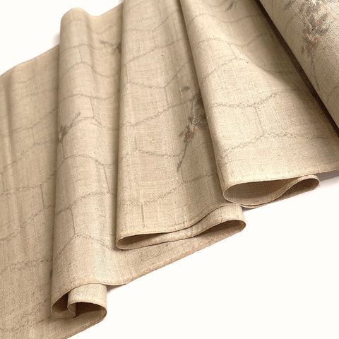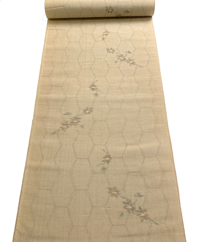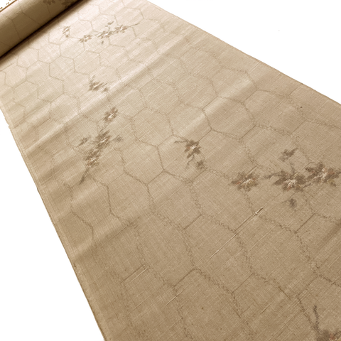 Slubby parchment/ecru/beige, lightweight and slubby, with floating, blurry flowers in gray with a bit of white and light red. Hexagon-shapes which in Japan signify tortoise shells, or Kikko. Not a print, it's all done in the difficult ikat weave. Thin, light silk is slightly crisp, with no drape and a bit of body. The ecru color does get slightly lighter or darker in some areas, adding to its antique look - we're not sure if it's intentional or not. 14" wide, sold by the full yard and we'll cut yours in one piece from the bolt. 100% Silk. Age unknown. Japan.