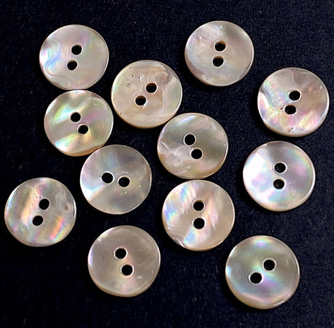 So lustrous, iridescent and shiny! 11mm / 7/16" Golden Abalone buttons in warm champagne beige and pearly rainbows. A few have wavy colorful stripes and other colors that come and go depending on the light. Lots of variance, personality, sheen and glow in these natural beauties. Sold per pack of 36 buttons.