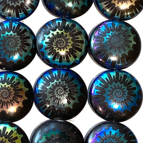 Jet Black+Teal Rainbow Beads, Ammonite Swirl, Czech Glass 13/16" / 20mm, Pack of 4 Beads #L-492