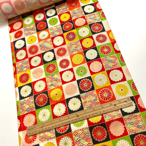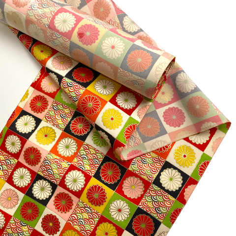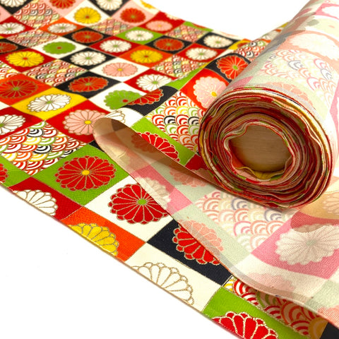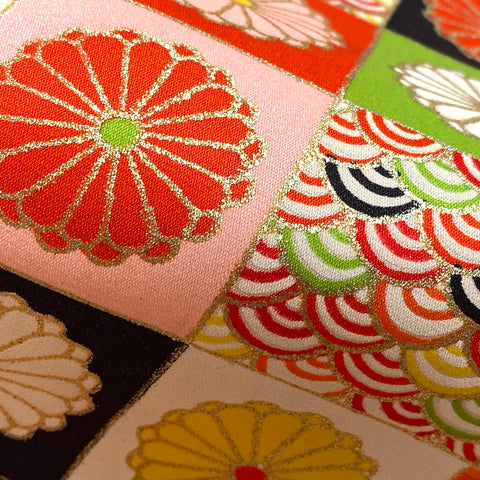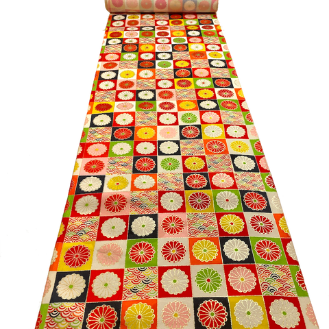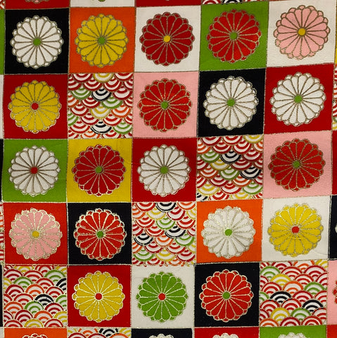 Like a patchwork, but it's a print. Each grid is almost 2" x 2" (1-7/8", actually) with brighter-than-bright mums and wave symbols. Each image has outlining in sparkly metallic goldish-silver. We count seven full squares across the width, and the color patterns repeat after 8 squares down the length. This silk is thin and light but crisp, with body and a bit of sheen, and no drape. So many colors, so vibrant! 14" wide and sold by the full yard, we'll cut yours in one piece from the vintage bolt. Possibly originally designed for a girls' kimono? We are told it's quite old, and the back is fascinating; it looks like a jacquard weave with clouds. We haven't checked the whole bolt but we see no condition issues in the first few yards. Japan.