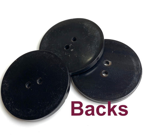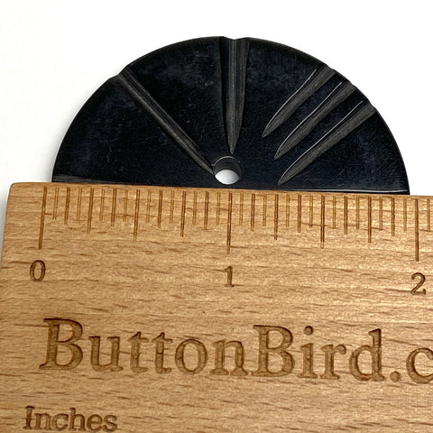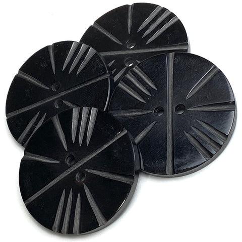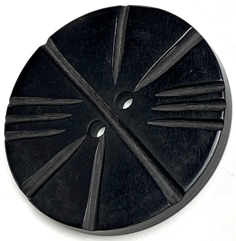 Large, flat disk, smooth black button hand-carved from water buffalo horn. Eleven recessed lines / slashes are gray. Dynamic, strong but light, deep true black, satin sheen. Shape, size, and color are quite consistent button to button; the slashes may vary a bit since they're done by hand one at a time by button artisans. Backs are solid black. This is the larger size, 2" diameter, about 3/16" thick, with hole size about 3.75mm. India. Sold per button.