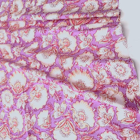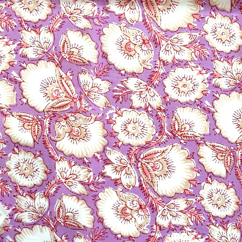 100% Cotton, 42"-44" wide and 1 yard long. Purple/Lilac, white, red, pink, and tan. It's lightweight, thin, soft, fairly tightly woven, slightly sheer. Blockprinted in India. The first photo is best for color. Vivid, alive and lovely!