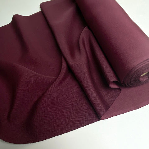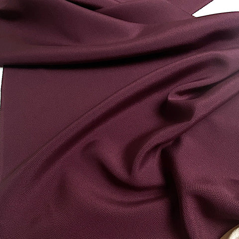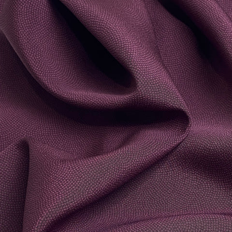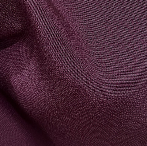 Plum and darker plum, with overall design of sooo tiny dots in the print, so it looks solid or lightly textured, but it's a smooth crepe. Almost like fingerprints, the design is nested arches, low in contrast as you can see, and all done with dots. This silk is thin, light, supple, flowy, soft and drapey. The back is solid, with no dots, in the slightly lighter plum color. The crepe texture is subtle; this silk is quite smooth. We were told there may be a few small spots but we haven't found them; if we do we'll add photos.  14" wide and sold by the full yard, we'll cut yours in one piece from the vintage bolt. Possibly rare? We've seen lots of komon dot prints but never a solid looking one like this. It's stunning. 100% Silk. Japan.